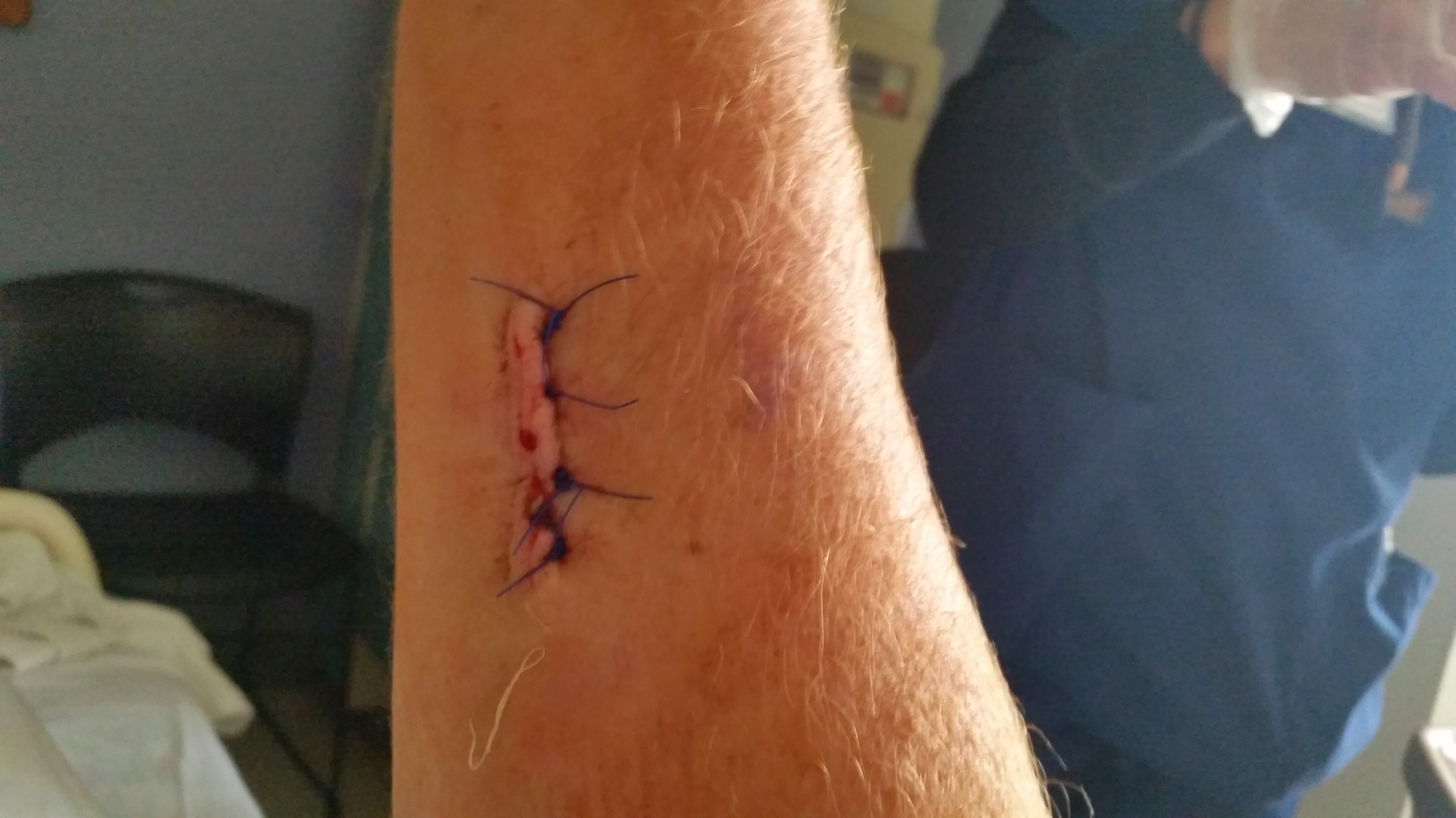 And yeah, every time I got back up on the ladder and drilled the hole, I’d set the screw gun down right back on the sloped roof again and it would slide off and I’d have to rescue it again. Until maybe the fifth time, when the drill slid down, and I lunged out to snag it, and cradled it to my body like a baby (or a football). The movement was swift enough that I just jammed the bit straight into my forearm. Luckily it didn’t engage the motor, and didn’t screw into my arm or do any twisty damage, but it buried over 2 inches of hard metal bit in my squishy bits.